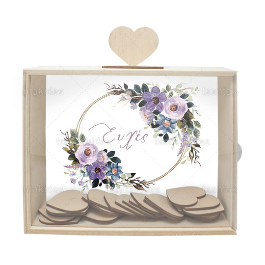 Ξύλινο κουτί ευχών γάμου εκτυπωμένο με θέμα Purple Gold Wreath
