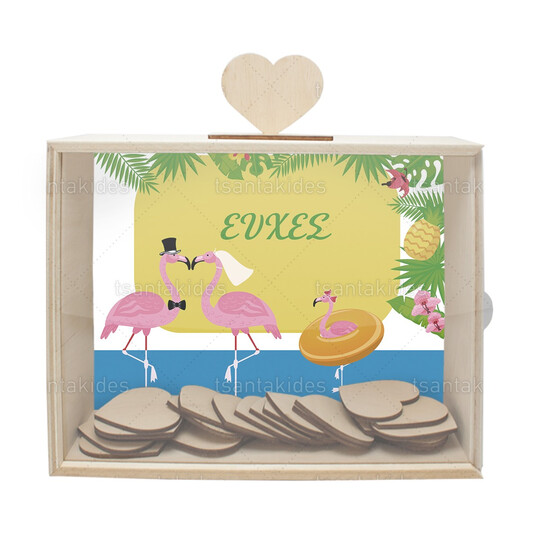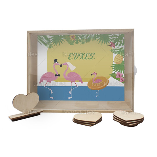 Ξύλινο κουτί ευχών γάμου εκτυπωμένο με θέμα Flamingo Summer Story