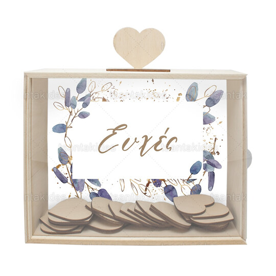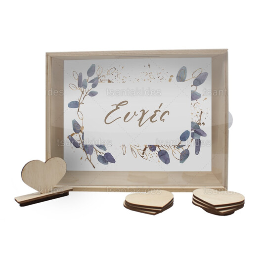 Το κουτί συνοδεύεται από 50 ατύπωτες ξύλινες καρδιές για τις ευχές και μια ξύλινη καρδιά-καπάκι για την θυρίδα στο πάνω μέρος του κουτιού.