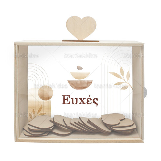 Το κουτί συνοδεύεται από 50 ατύπωτες ξύλινες καρδιές για τις ευχές και μια ξύλινη καρδιά-καπάκι για την θυρίδα στο πάνω μέρος του κουτιού.