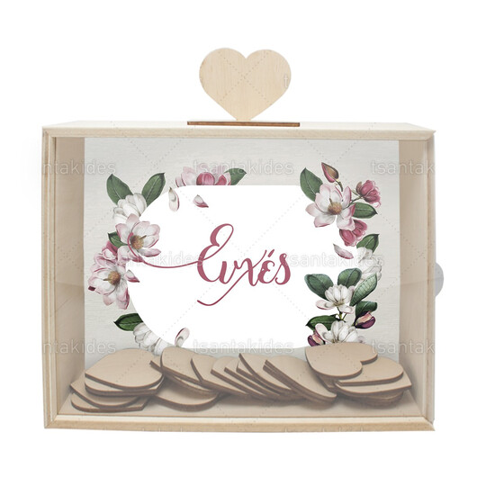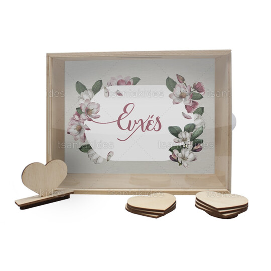 Ξύλινο κουτί ευχών γάμου εκτυπωμένο με λευκές και φουξ μανόλιες
