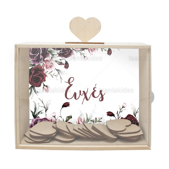 Ξύλινο κουτί ευχών γάμου εκτυπωμένο με floral σχεδιασμό σε burgundy και μωβ χρωματισμούς