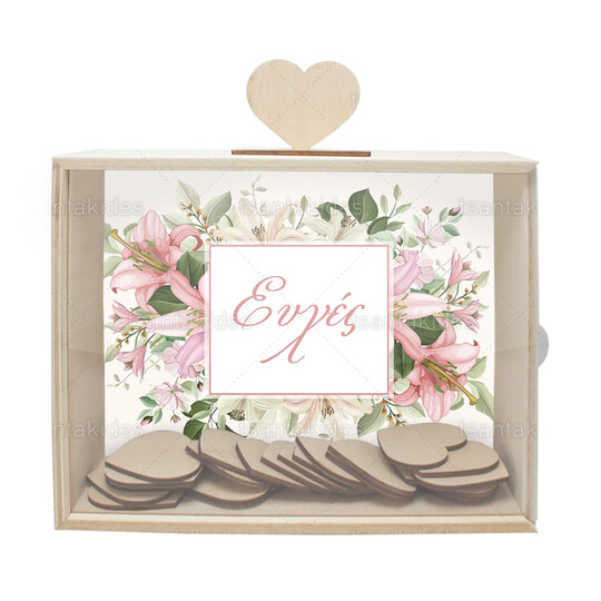 Ξύλινο κουτί ευχών γάμου εκτυπωμένο με floral σύνθεση από ροζ λίλιουμ