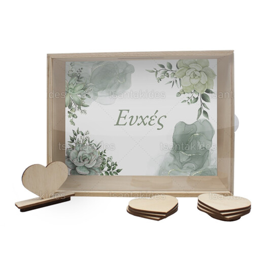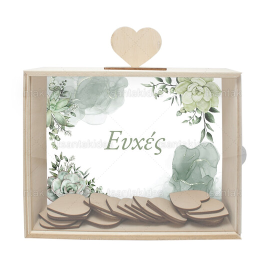 Ξύλινο κουτί ευχών γάμου εκτυπωμένο με floral σύνθεση από παχύφυτα και ευκάλυπτο