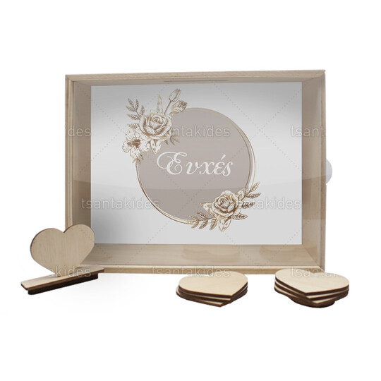 Ξύλινο κουτί ευχών γάμου εκτυπωμένο με xρυσό στεφάνι από τριαντάφυλλα