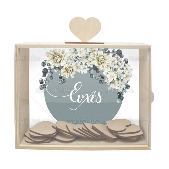 Ξύλινο κουτί ευχών γάμου εκτυπωμένο με dusty blue floral σχεδιασμό σε οβαλ