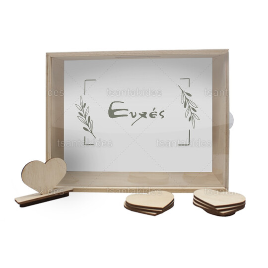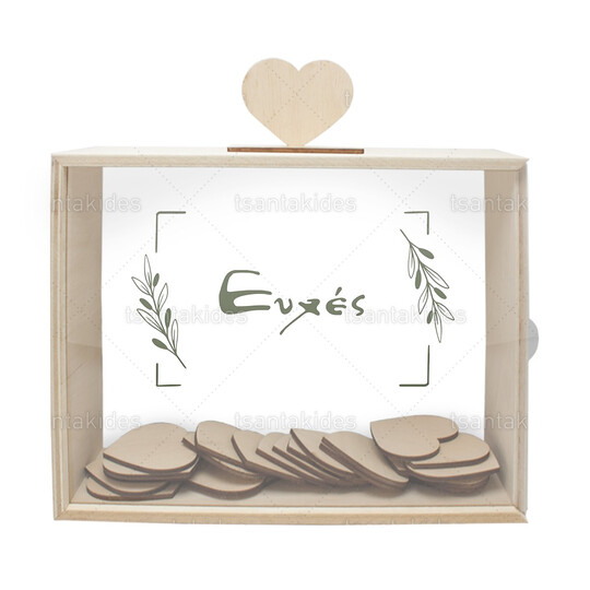 Το κουτί συνοδεύεται από 50 ατύπωτες ξύλινες καρδιές για τις ευχές και μια ξύλινη καρδιά-καπάκι για την θυρίδα στο πάνω μέρος του κουτιού.