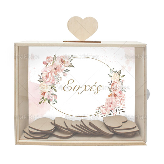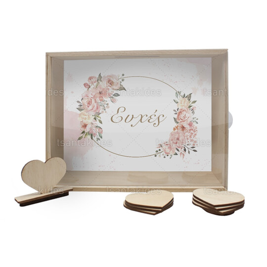 Ξύλινο κουτί ευχών γάμου εκτυπωμένο με floral peach αποχρώσεις και χρυσό οβάλ στεφάνι