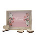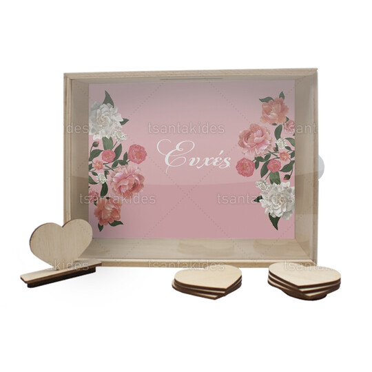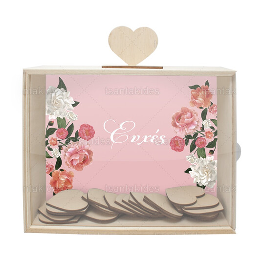 Ξύλινο κουτί ευχών γάμου εκτυπωμένο με λογότυπο LOVE με τριαντάφυλλα και ροζ backround