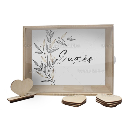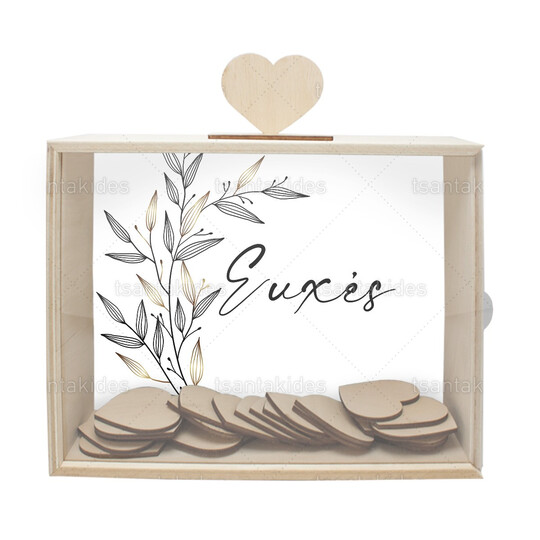 Το κουτί συνοδεύεται από 50 ατύπωτες ξύλινες καρδιές για τις ευχές και μια ξύλινη καρδιά-καπάκι για την θυρίδα στο πάνω μέρος του κουτιού.
