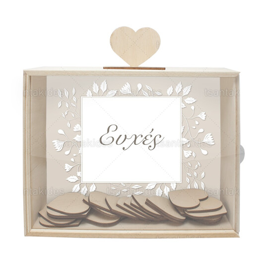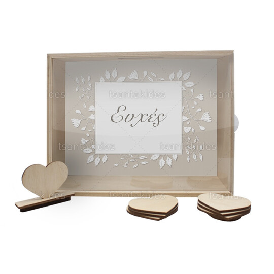 Το κουτί συνοδεύεται από 50 ατύπωτες ξύλινες καρδιές για τις ευχές και μια ξύλινη καρδιά-καπάκι για την θυρίδα στο πάνω μέρος του κουτιού.