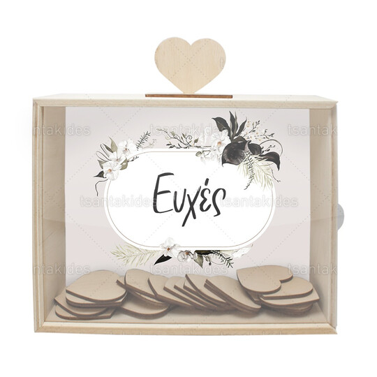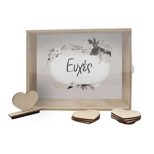 Το κουτί συνοδεύεται από 50 ατύπωτες ξύλινες καρδιές για τις ευχές και μια ξύλινη καρδιά-καπάκι για την θυρίδα στο πάνω μέρος του κουτιού.