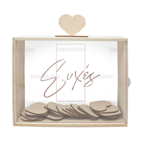 Το κουτί συνοδεύεται από 50 ατύπωτες ξύλινες καρδιές για τις ευχές και μια ξύλινη καρδιά-καπάκι για την θυρίδα στο πάνω μέρος του κουτιού.