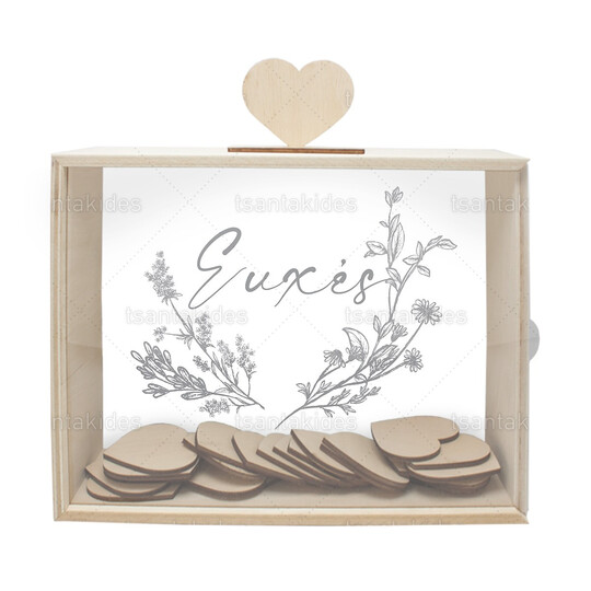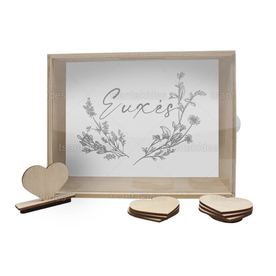 Το κουτί συνοδεύεται από 50 ατύπωτες ξύλινες καρδιές για τις ευχές και μια ξύλινη καρδιά-καπάκι για την θυρίδα στο πάνω μέρος του κουτιού.