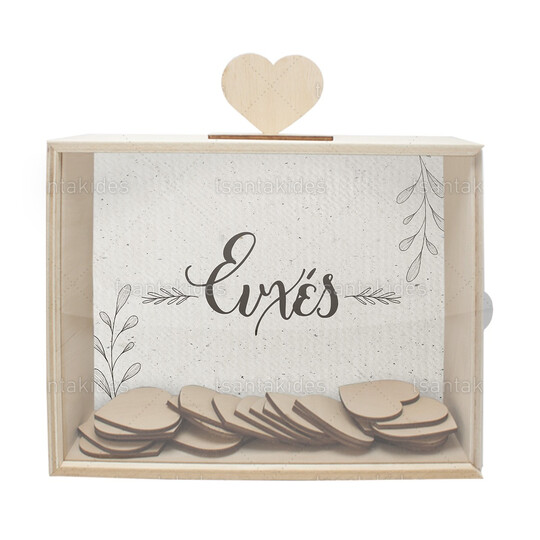 Το κουτί συνοδεύεται από 50 ατύπωτες ξύλινες καρδιές για τις ευχές και μια ξύλινη καρδιά-καπάκι για την θυρίδα στο πάνω μέρος του κουτιού.