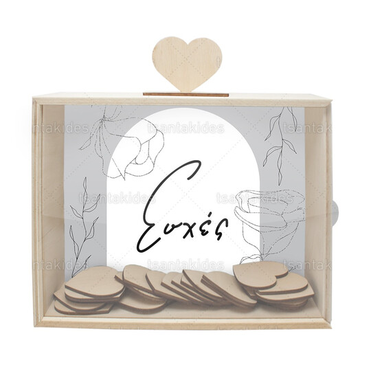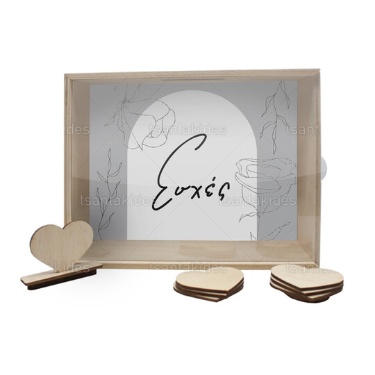 Το κουτί συνοδεύεται από 50 ατύπωτες ξύλινες καρδιές για τις ευχές και μια ξύλινη καρδιά-καπάκι για την θυρίδα στο πάνω μέρος του κουτιού.