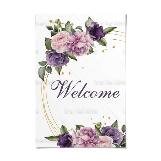 Καρτολίνο γάμου εκτυπωμένο με κυκλικό στεφανάκι, μοβ λουλούδια και χρυσές λεπτομέρειες