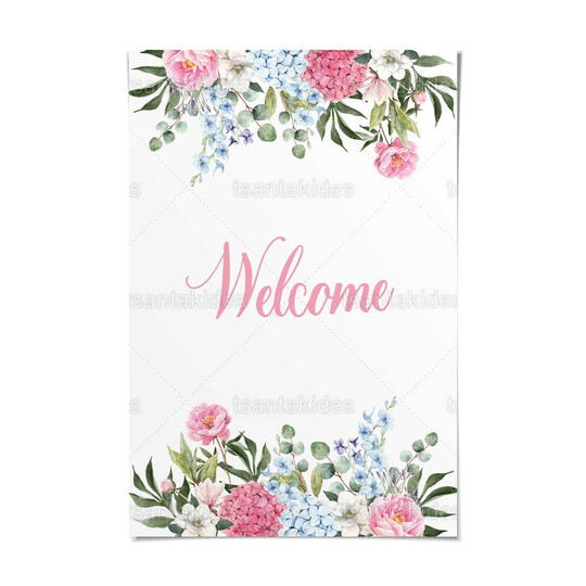 Καρτολίνο γάμου εκτυπωμένο με floral σύνθεση από γαλάζιες και ροζ ορτανσίες