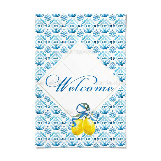 Καρτολίνο γάμου εκτυπωμένο με λεμόνια και μπλε ρουά χρωματισμούς εμπνευσμένο από τα μαγιόλικα ιταλικά κεραμικά