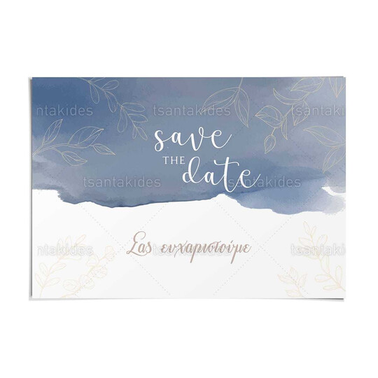Χαρτινό σουπλά γάμου εκτυπωμένο με θέμα save the date και γραμμικά κλαδιά δέντρου σε navy watercolor αποχρώσεις
