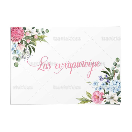 Χαρτινό σουπλά γάμου εκτυπωμένο με floral σύνθεση από γαλάζιες και ροζ ορτανσίες