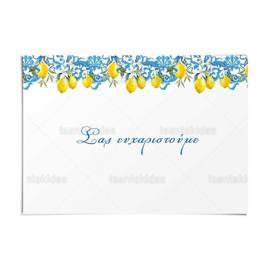 Χαρτινό σουπλά γάμου εκτυπωμένο με λεμόνια και μπλε ρουά χρωματισμούς εμπνευσμένο από τα μαγιόλικα ιταλικά κεραμικά