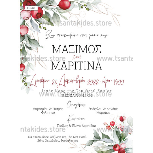 Χριστουγεννιάτικο προσκλητήριο γάμου. Η κάρτα του προσκλητηρίου είναι τυπωμένη σε λευκό ματ χαρτί 250 γρ. Το προσκλητήριο διαθέτει φάκελο διάστασης 19,5 x 14,5 εκ. σε χαρτί της επιλογής σας από τους αναγραφόμενους κωδικούς.