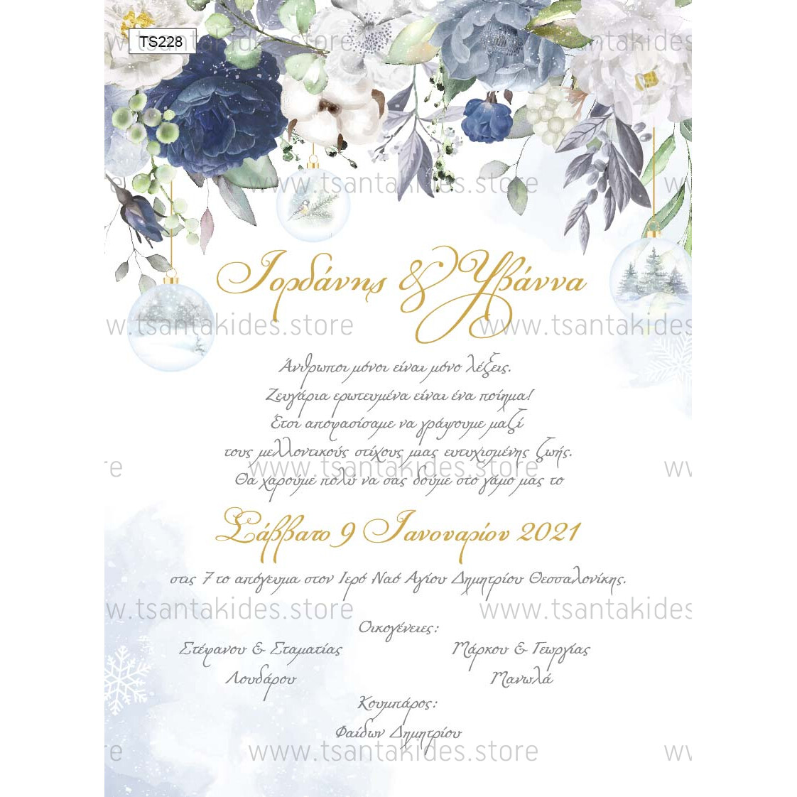 Χριστουγεννιάτικο προσκλητήριο γάμου. Η κάρτα του προσκλητηρίου είναι τυπωμένη σε λευκό ματ χαρτί 250 γρ. Το προσκλητήριο διαθέτει φάκελο διάστασης 19,5 x 14,5 εκ. σε χαρτί της επιλογής σας από τους αναγραφόμενους κωδικούς.