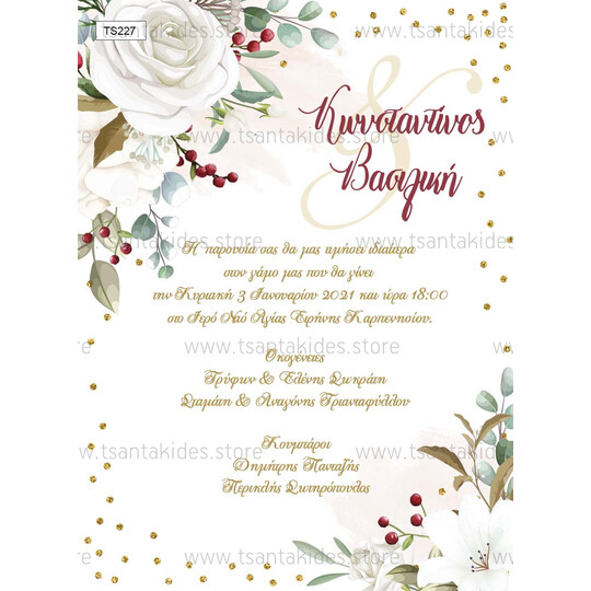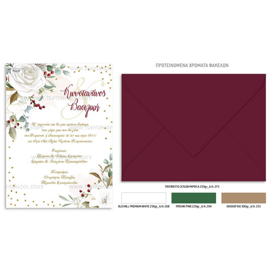 Χριστουγεννιάτικο προσκλητήριο γάμου. Η κάρτα του προσκλητηρίου είναι τυπωμένη σε λευκό ματ χαρτί 250 γρ. Το προσκλητήριο διαθέτει φάκελο διάστασης 19,5 x 14,5 εκ. σε χαρτί της επιλογής σας από τους αναγραφόμενους κωδικούς.