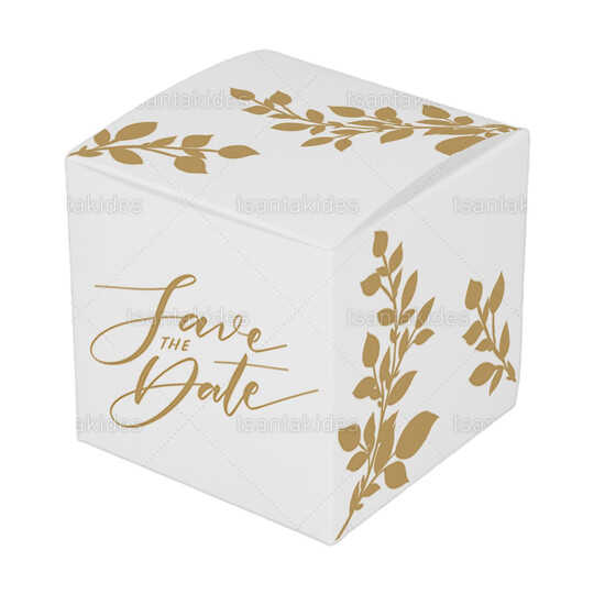 Κουτί εκτυπωμένο με λογότυπο save the date και γραμμικά gold κλαδιά