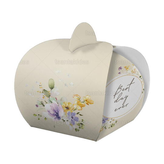 Κούτι εκτυπωμένο με χρυσή αψίδα και σύνθεση από pastel λιλά και κίτρινα λουλούδια