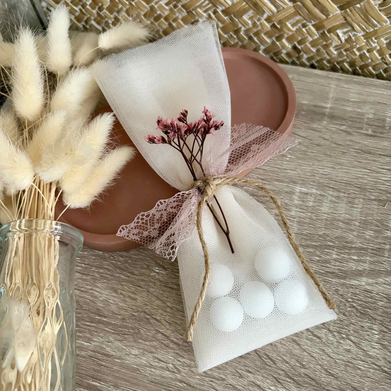 Μπομπονιέρα γάμου με γαλλικό τούλι ιβουάρ με αποξηραμένα crystal flowers, δεμένη με κορδόνι γιούτα και δαντέλα σάπιο μήλο.