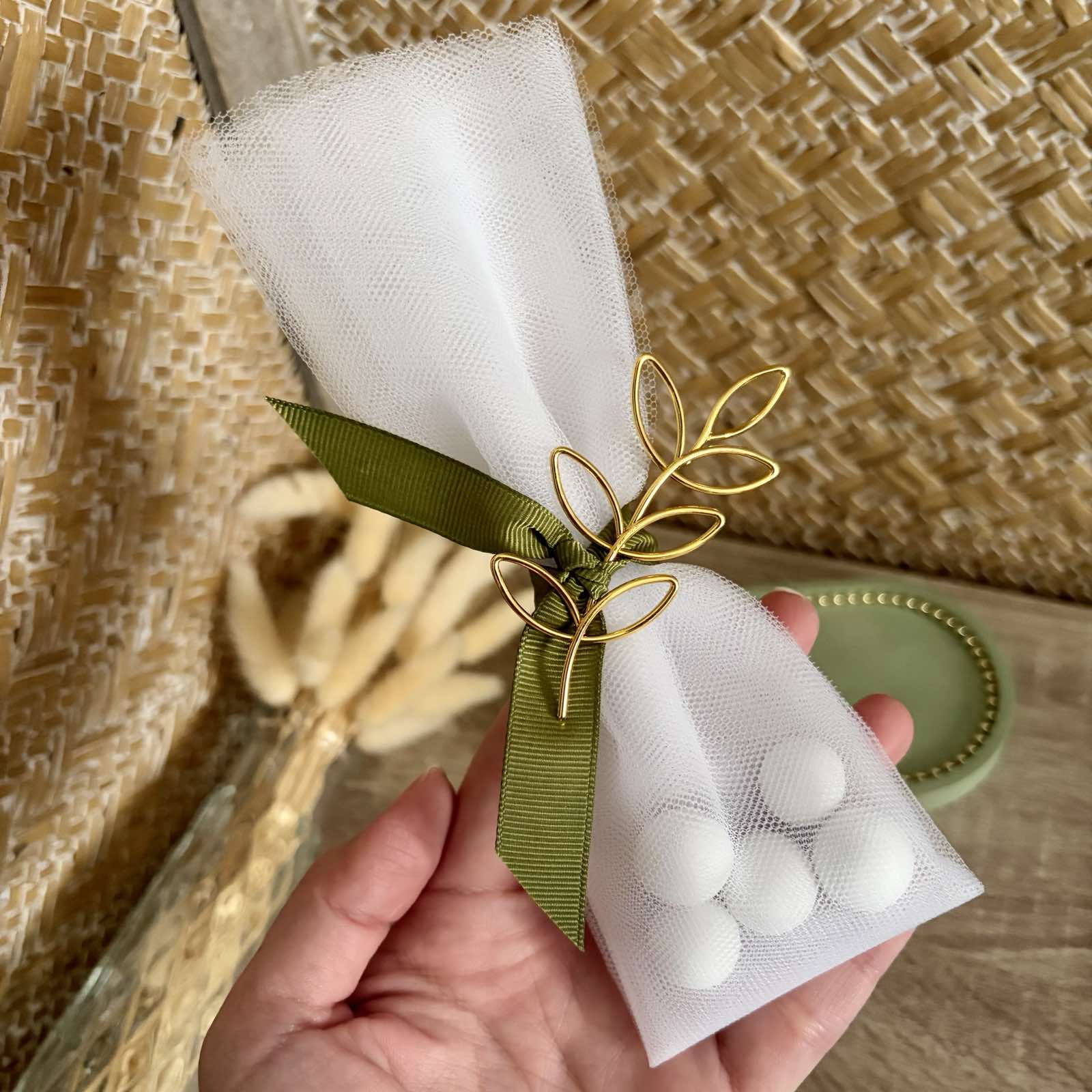 Μπομπονιέρα γάμου με γαλλικό λευκό τούλι με μεταλλικό κλαδί ελιάς σε χρυσό χρώμα, δεμένο με γκρο λαδί κορδέλα.