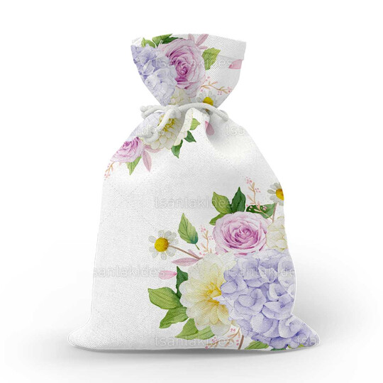 Υφασμάτινο πουγκί εκτυπωμένο με floral ρομαντικές συνθέσεις με ορτανσίες και χαμομήλι