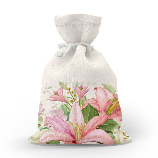 Υφασμάτινο πουγκί εκτυπωμένο με floral σύνθεση από ροζ λίλιουμ
