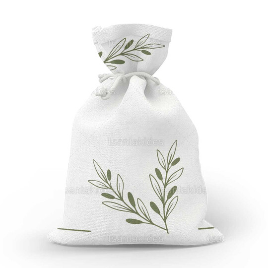 Υφασμάτινο πουγκί εκτυπωμένο σε λαδί αποχρώσεις και λογότυπο η ημερομηνία με κλαδιά ελιάς