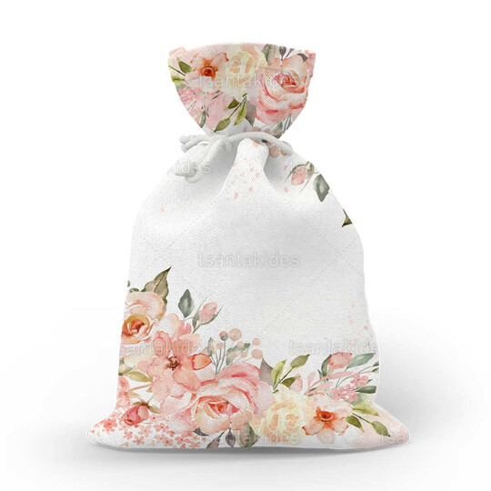 Υφασμάτινο πουγκί εκτυπωμένο με floral peach αποχρώσεις και χρυσό οβάλ στεφάνι
