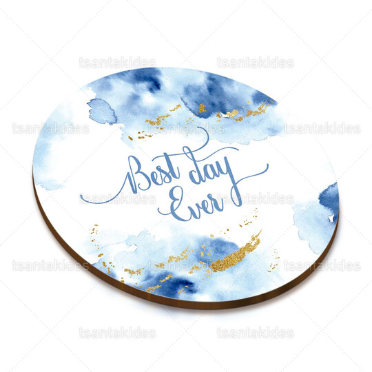 Ξύλινο σουβέρ γάμου εκτυπωμένο με μπλε και χρυσαφί λεπτομέρειες