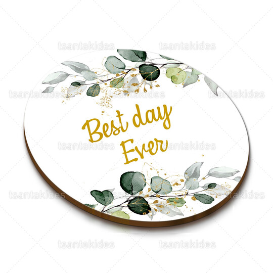 Ξύλινο σουβέρ γάμου εκτυπωμένο με greenery design και χρυσαφί λεπτομέρειες