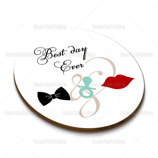 Ξύλινο σουβέρ γάμου εκτυπωμένο με θέμα το παπιγιόν, την πιπίλα και τα χειλάκια