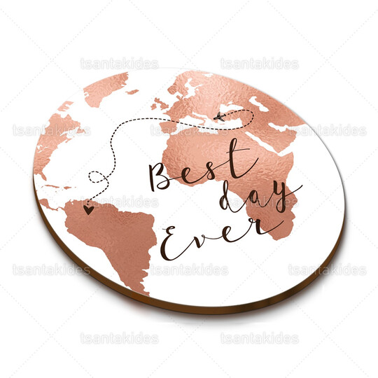 Ξύλινο σουβέρ γάμου εκτυπωμένο σε travel, save the date και rose gold χρωματισμούς