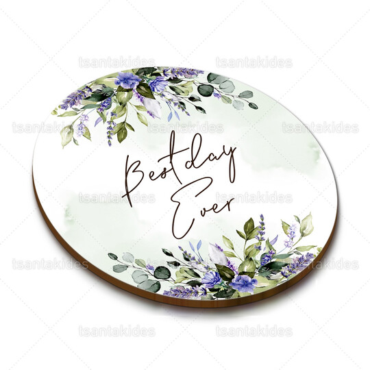 Ξύλινο σουβέρ γάμου εκτυπωμένομε greenery στοιχεία και λεβάντα