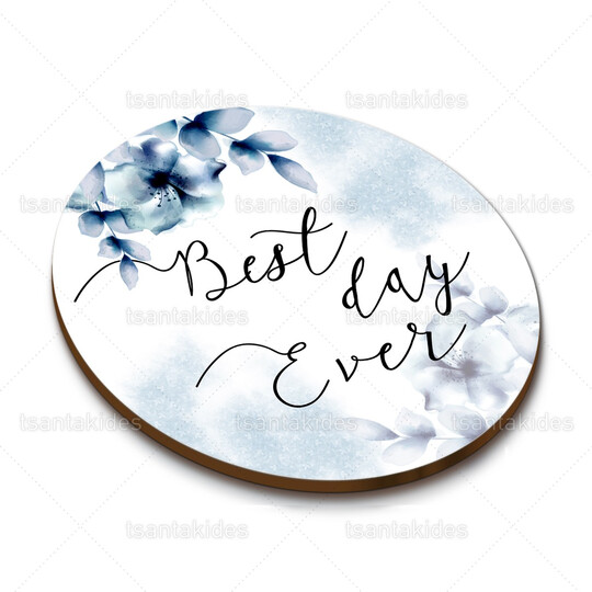 Ξύλινο σουβέρ γάμου εκτυπωμένομε dusty blue λουλούδια και χρυσές λεπτομέρειες