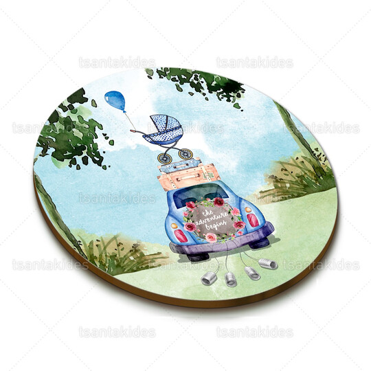 Ξύλινο σουβέρ γάμου εκτυπωμένο με θέμα Blue Car in Adventure