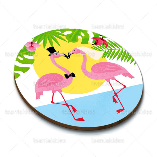 Ξύλινο σουβέρ γάμου εκτυπωμένο με θέμα Flamingo Summer Story