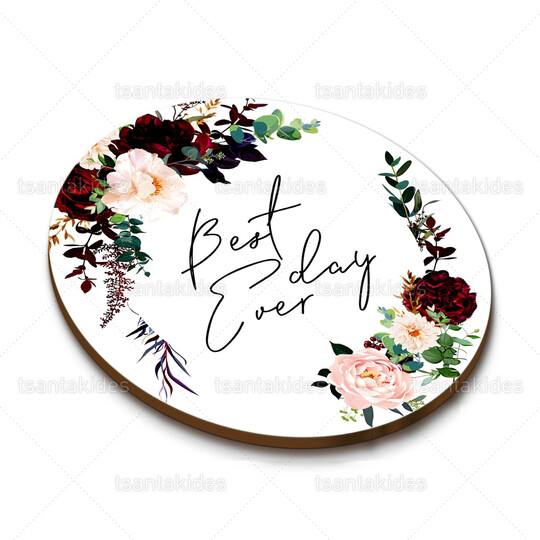 Ξύλινο σουβέρ γάμου εκτυπωμένο με floral σχεδιασμό σε burgundy και ροζ pastel χρωματισμούς