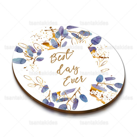 Ξύλινο σουβέρ γάμου εκτυπωμένο με μοβ χρωματισμούς και χρυσές λεπτομέρειες