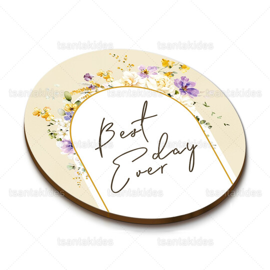 Ξύλινο σουβέρ γάμου εκτυπωμένο με χρυσή αψίδα και σύνθεση από pastel λιλά και κίτρινα λουλούδια
