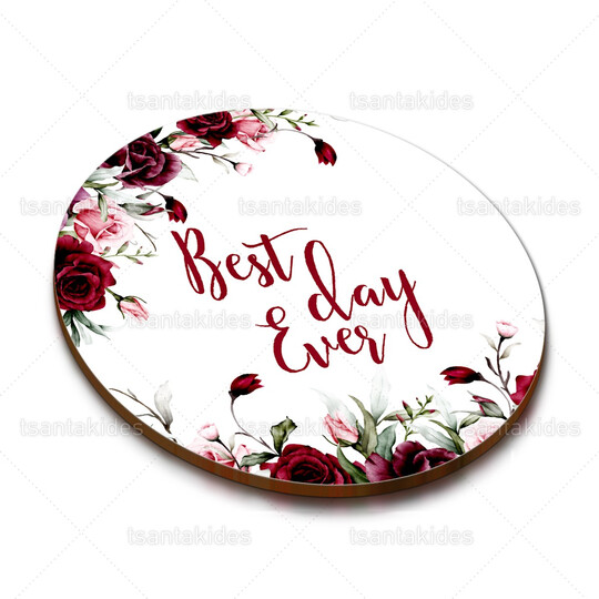 Ξύλινο σουβέρ γάμου εκτυπωμένο με floral σχεδιασμό σε burgundy και μωβ χρωματισμούς