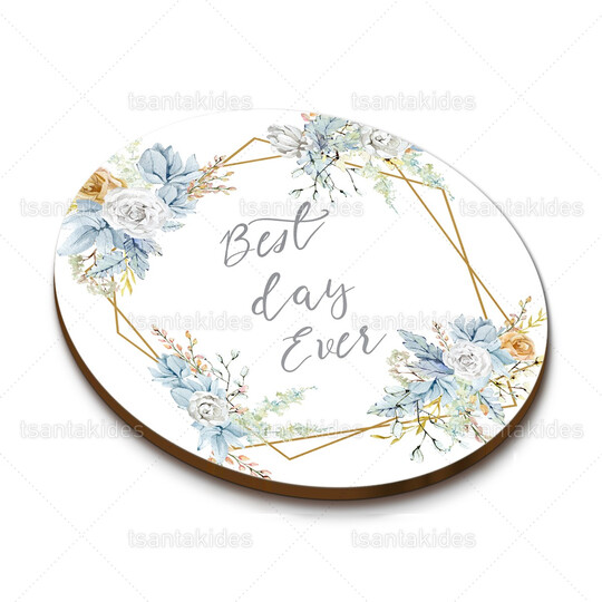 Ξύλινο σουβέρ γάμου εκτυπωμένο με dusty blue λουλούδια και χρυσό γεωμετρικό σχήμα